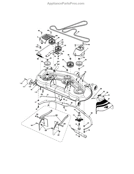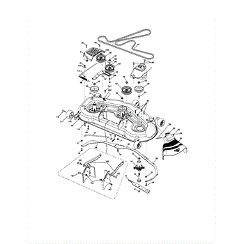 Discharge deflector for lawn tractors. Mounts to the mower deck to control grass clippings. Replace if cracked, broken, or missing for proper debris flow.
