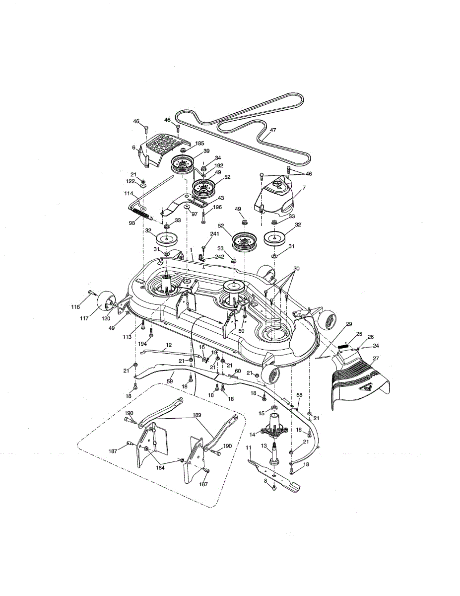 Discharge deflector for lawn tractors. Mounts to the mower deck to control grass clippings. Replace if cracked, broken, or missing for proper debris flow.