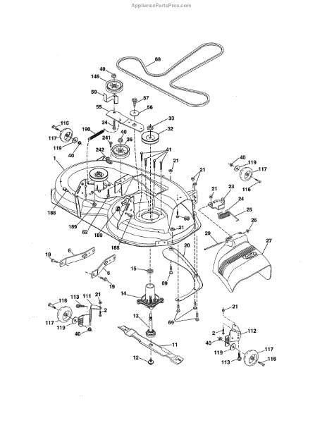 This no grease mandrel assembly is the part that houses the shaft where the mower blade attaches. It is mounted to the deck of the mower by three bolts, which are sold separately. The mounting holes on the mandrel housing are not threaded, but the bolts used to secure the mandrel to the deck are self-tapping. If the lawnmower is no longer providing an even cut, there may be a problem with the mandrel assembly. A broken or damaged mandrel assembly can severely reduce the mower's cutting performance. Replace it as soon as possible. The mandrel shaft goes through the deck, and the pulleys are attached to them, then the belt that drives the mandrels is placed in the pulleys. A spacer must be installed under the pulley. Failing to use a spacer or installing it on top of the pulley will result in damage to the shaft and pulley. This mandrel assembly is compatible with Ariens, Craftsman, Husqvarna, Poulan, and Weed Eater lawn mower models. It is an OEM part sourced directly from the manufacturer and is sold individually. The mandrel assembly includes a housing, shaft assembly, bearing, and nut only; the pulley/washer and blade bolt/washers are not included.