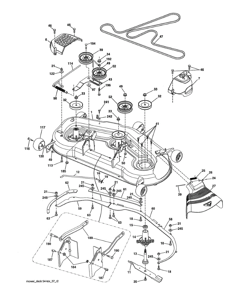 Discharge deflector for lawn tractors. Mounts to the mower deck to control grass clippings. Replace if cracked, broken, or missing for proper debris flow.