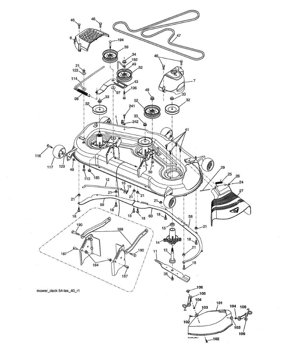 Discharge deflector for lawn tractors. Mounts to the mower deck to control grass clippings. Replace if cracked, broken, or missing for proper debris flow.