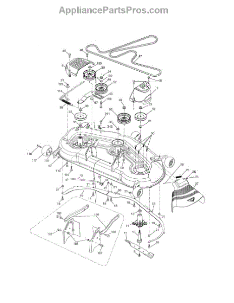 This no grease mandrel assembly is the part that houses the shaft where the mower blade attaches. It is mounted to the deck of the mower by three bolts, which are sold separately. The mounting holes on the mandrel housing are not threaded, but the bolts used to secure the mandrel to the deck are self-tapping. If the lawnmower is no longer providing an even cut, there may be a problem with the mandrel assembly. A broken or damaged mandrel assembly can severely reduce the mower's cutting performance. Replace it as soon as possible. The mandrel shaft goes through the deck, and the pulleys are attached to them, then the belt that drives the mandrels is placed in the pulleys. A spacer must be installed under the pulley. Failing to use a spacer or installing it on top of the pulley will result in damage to the shaft and pulley. This mandrel assembly is compatible with Ariens, Craftsman, Husqvarna, Poulan, and Weed Eater lawn mower models. It is an OEM part sourced directly from the manufacturer and is sold individually. The mandrel assembly includes a housing, shaft assembly, bearing, and nut only; the pulley/washer and blade bolt/washers are not included.