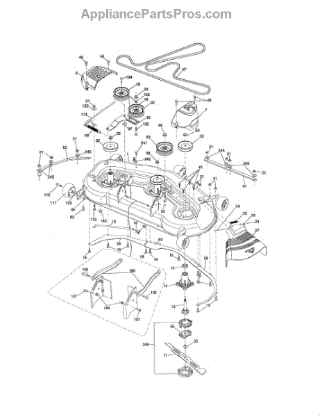 Center baffle for 54-inch riding mower decks. Directs grass clippings for even cutting. Replace if cracked, bent, or missing for proper airflow.