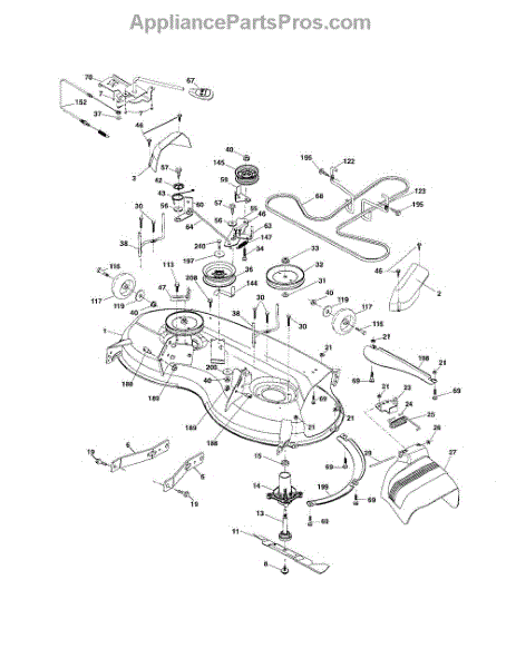 This no grease mandrel assembly is the part that houses the shaft where the mower blade attaches. It is mounted to the deck of the mower by three bolts, which are sold separately. The mounting holes on the mandrel housing are not threaded, but the bolts used to secure the mandrel to the deck are self-tapping. If the lawnmower is no longer providing an even cut, there may be a problem with the mandrel assembly. A broken or damaged mandrel assembly can severely reduce the mower's cutting performance. Replace it as soon as possible. The mandrel shaft goes through the deck, and the pulleys are attached to them, then the belt that drives the mandrels is placed in the pulleys. A spacer must be installed under the pulley. Failing to use a spacer or installing it on top of the pulley will result in damage to the shaft and pulley. This mandrel assembly is compatible with Ariens, Craftsman, Husqvarna, Poulan, and Weed Eater lawn mower models. It is an OEM part sourced directly from the manufacturer and is sold individually. The mandrel assembly includes a housing, shaft assembly, bearing, and nut only; the pulley/washer and blade bolt/washers are not included.