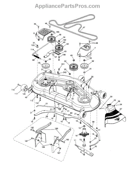 This no grease mandrel assembly is the part that houses the shaft where the mower blade attaches. It is mounted to the deck of the mower by three bolts, which are sold separately. The mounting holes on the mandrel housing are not threaded, but the bolts used to secure the mandrel to the deck are self-tapping. If the lawnmower is no longer providing an even cut, there may be a problem with the mandrel assembly. A broken or damaged mandrel assembly can severely reduce the mower's cutting performance. Replace it as soon as possible. The mandrel shaft goes through the deck, and the pulleys are attached to them, then the belt that drives the mandrels is placed in the pulleys. A spacer must be installed under the pulley. Failing to use a spacer or installing it on top of the pulley will result in damage to the shaft and pulley. This mandrel assembly is compatible with Ariens, Craftsman, Husqvarna, Poulan, and Weed Eater lawn mower models. It is an OEM part sourced directly from the manufacturer and is sold individually. The mandrel assembly includes a housing, shaft assembly, bearing, and nut only; the pulley/washer and blade bolt/washers are not included.