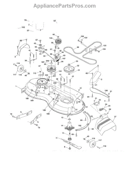 This no grease mandrel assembly is the part that houses the shaft where the mower blade attaches. It is mounted to the deck of the mower by three bolts, which are sold separately. The mounting holes on the mandrel housing are not threaded, but the bolts used to secure the mandrel to the deck are self-tapping. If the lawnmower is no longer providing an even cut, there may be a problem with the mandrel assembly. A broken or damaged mandrel assembly can severely reduce the mower's cutting performance. Replace it as soon as possible. The mandrel shaft goes through the deck, and the pulleys are attached to them, then the belt that drives the mandrels is placed in the pulleys. A spacer must be installed under the pulley. Failing to use a spacer or installing it on top of the pulley will result in damage to the shaft and pulley. This mandrel assembly is compatible with Ariens, Craftsman, Husqvarna, Poulan, and Weed Eater lawn mower models. It is an OEM part sourced directly from the manufacturer and is sold individually. The mandrel assembly includes a housing, shaft assembly, bearing, and nut only; the pulley/washer and blade bolt/washers are not included.