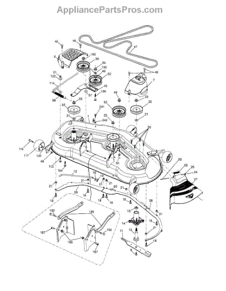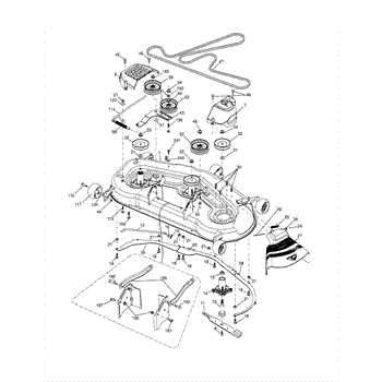 This no grease mandrel assembly is the part that houses the shaft where the mower blade attaches. It is mounted to the deck of the mower by three bolts, which are sold separately. The mounting holes on the mandrel housing are not threaded, but the bolts used to secure the mandrel to the deck are self-tapping. If the lawnmower is no longer providing an even cut, there may be a problem with the mandrel assembly. A broken or damaged mandrel assembly can severely reduce the mower's cutting performance. Replace it as soon as possible. The mandrel shaft goes through the deck, and the pulleys are attached to them, then the belt that drives the mandrels is placed in the pulleys. A spacer must be installed under the pulley. Failing to use a spacer or installing it on top of the pulley will result in damage to the shaft and pulley. This mandrel assembly is compatible with Ariens, Craftsman, Husqvarna, Poulan, and Weed Eater lawn mower models. It is an OEM part sourced directly from the manufacturer and is sold individually. The mandrel assembly includes a housing, shaft assembly, bearing, and nut only; the pulley/washer and blade bolt/washers are not included.