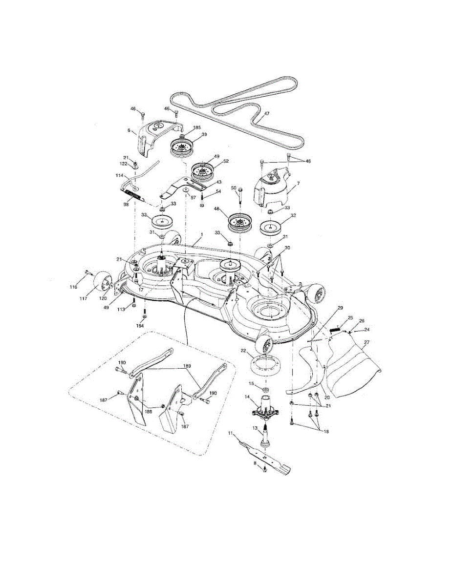 Deck spindle assembly that houses the blade mounting shaft on riding mowers. Bolts to the mower deck. Replace if housing is cracked, worn, or damaged.