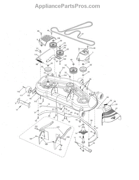 This no grease mandrel assembly is the part that houses the shaft where the mower blade attaches. It is mounted to the deck of the mower by three bolts, which are sold separately. The mounting holes on the mandrel housing are not threaded, but the bolts used to secure the mandrel to the deck are self-tapping. If the lawnmower is no longer providing an even cut, there may be a problem with the mandrel assembly. A broken or damaged mandrel assembly can severely reduce the mower's cutting performance. Replace it as soon as possible. The mandrel shaft goes through the deck, and the pulleys are attached to them, then the belt that drives the mandrels is placed in the pulleys. A spacer must be installed under the pulley. Failing to use a spacer or installing it on top of the pulley will result in damage to the shaft and pulley. This mandrel assembly is compatible with Ariens, Craftsman, Husqvarna, Poulan, and Weed Eater lawn mower models. It is an OEM part sourced directly from the manufacturer and is sold individually. The mandrel assembly includes a housing, shaft assembly, bearing, and nut only; the pulley/washer and blade bolt/washers are not included.