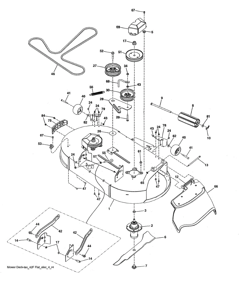 Extension spring for riding mower deck drive system. Replace when spring is stretched, broken, or missing to restore proper tension and deck operation.