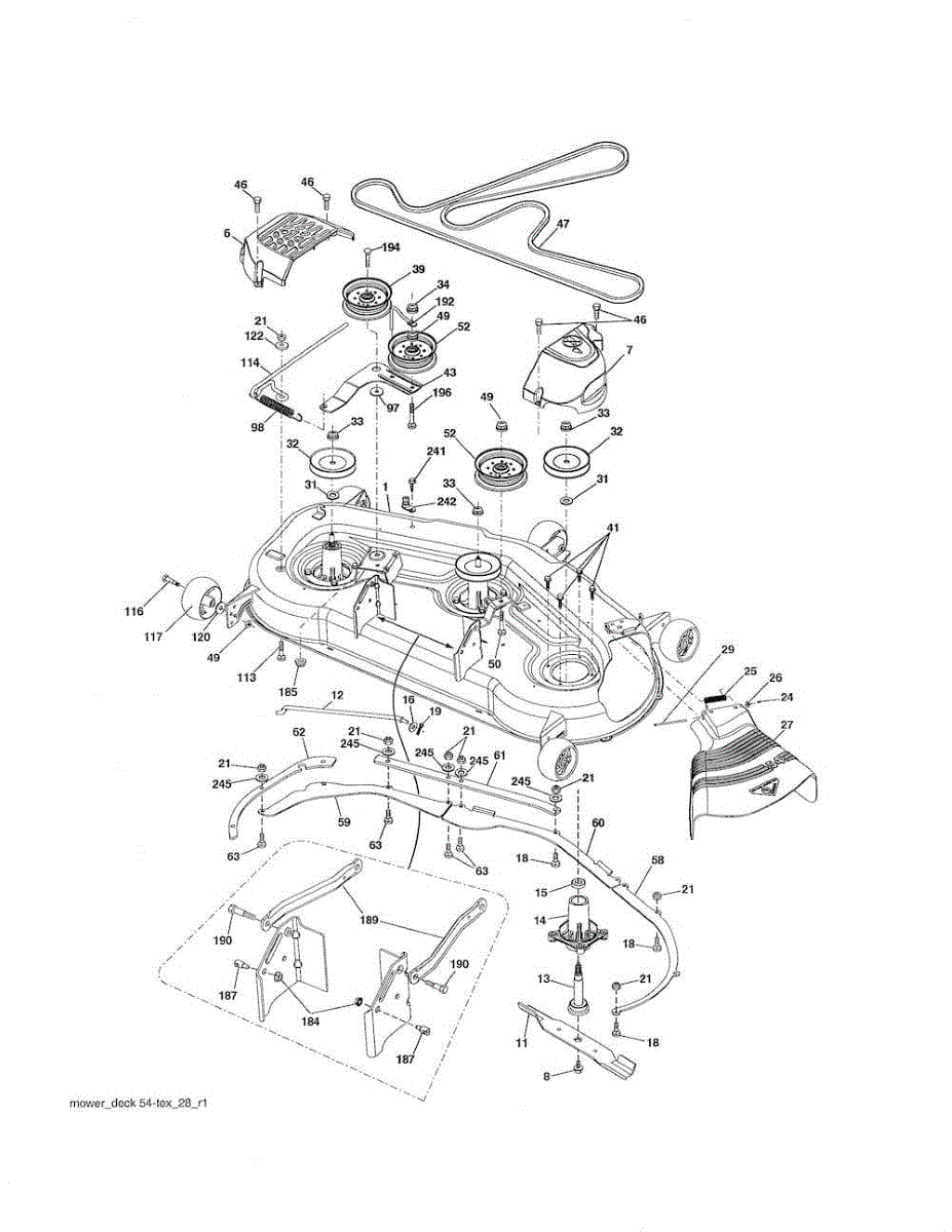 Secures the mower blade to the spindle on riding mowers and tractors. Replace if bolt is stripped, washer is damaged, or hardware is missing.