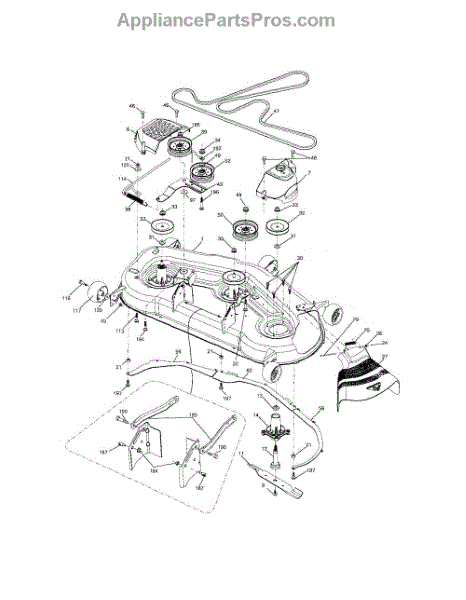 Center baffle for 54-inch riding mower decks. Directs grass clippings for even cutting. Replace if cracked, bent, or missing for proper airflow.