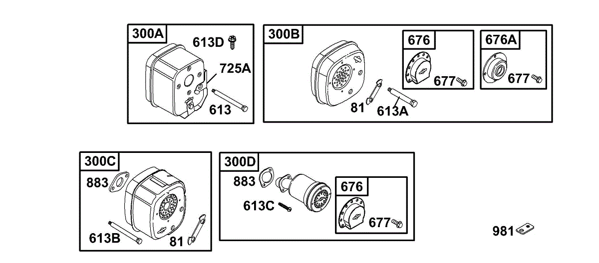 Replacement exhaust muffler for lawn mower engines. Reduces engine noise and absorbs vibrations. Replace if cracked, rusted, or excessively loud.