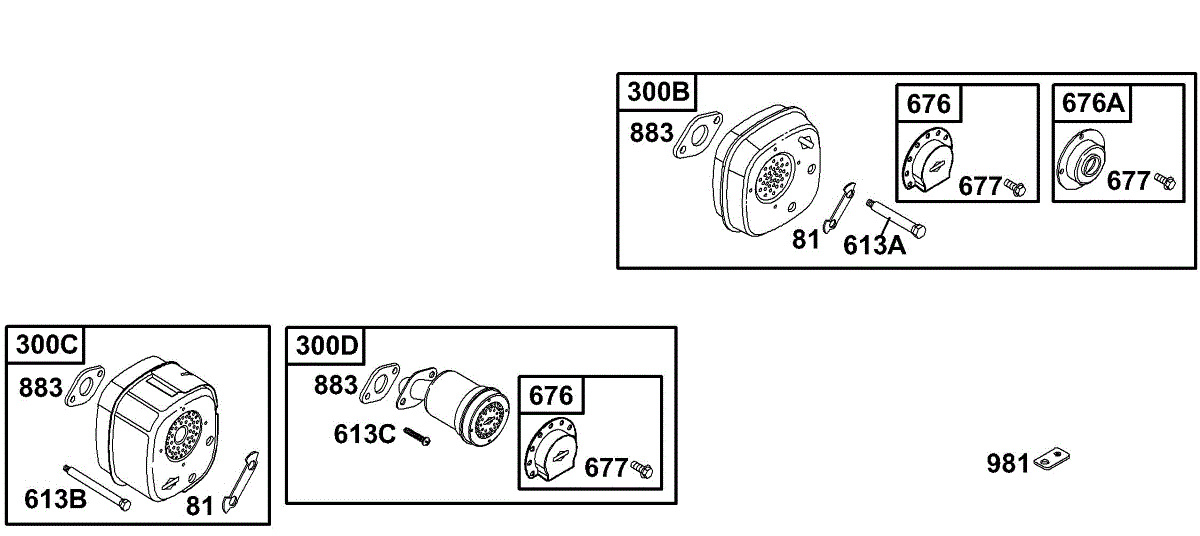 Replacement exhaust muffler for lawn mower engines. Reduces engine noise and absorbs vibrations. Replace if cracked, rusted, or excessively loud.