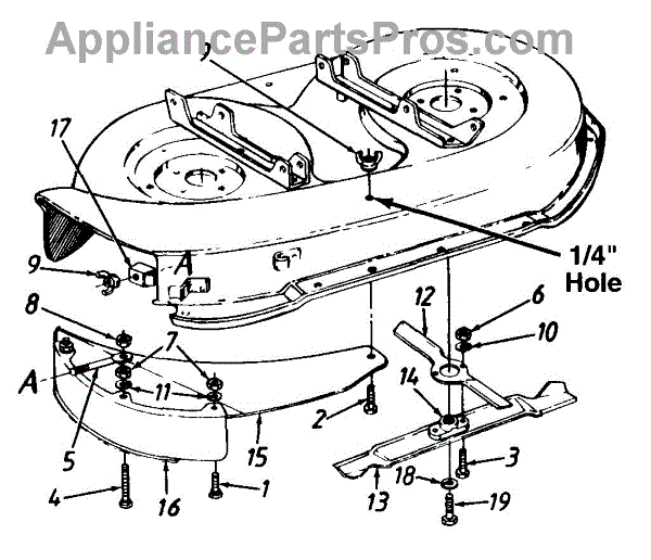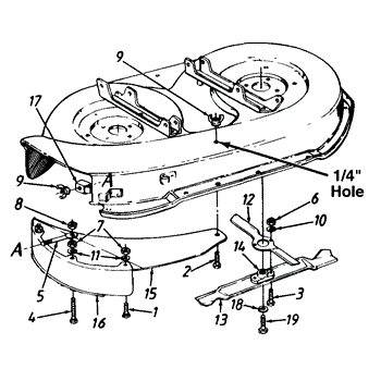 Hex screw that secures components on lawn tractors and outdoor power equipment. Replace if screw is stripped, missing, or damaged during maintenance.