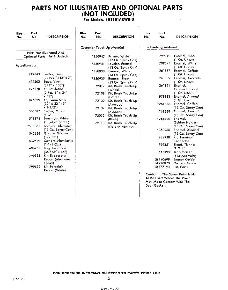 Parts for Whirlpool EHT161AKWR0: 12 - Not Illustrated And Optional Parts