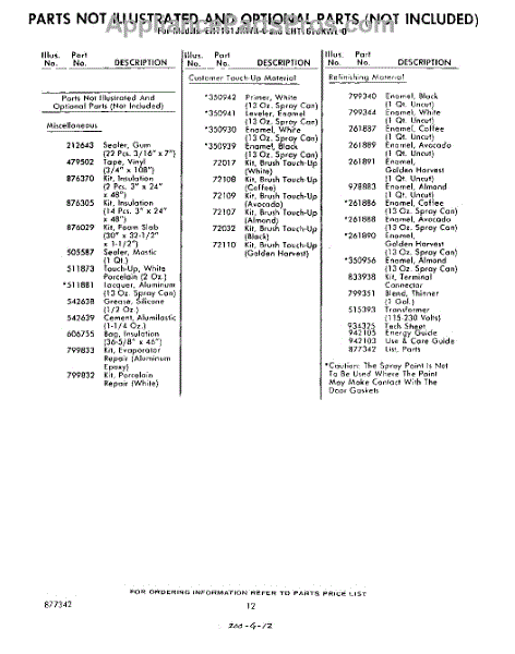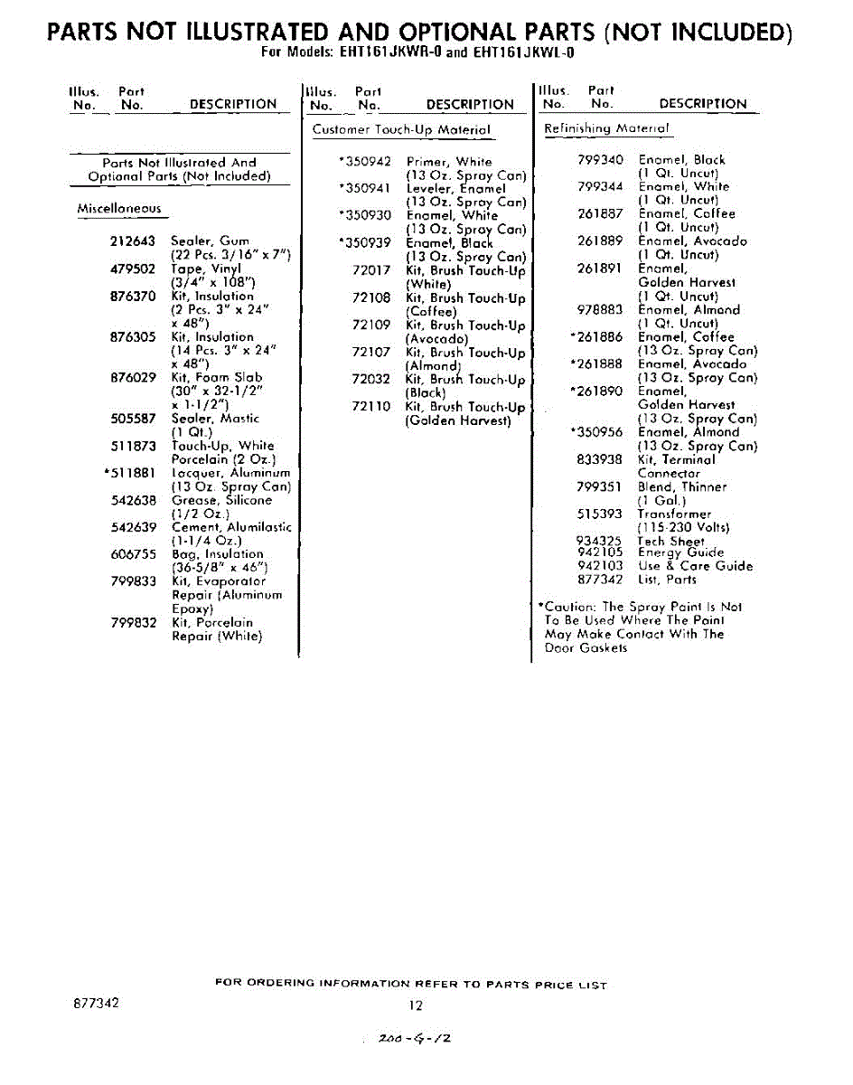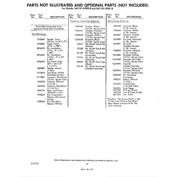 Parts for Whirlpool EHT161JKWR0: 12 - Not Illustrated And Optional Parts