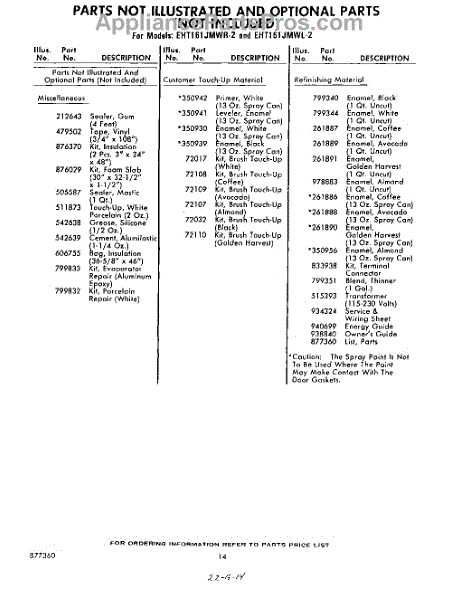 Parts for Whirlpool EHT161JMWL2: 14 - Not Illustrated And Optional Parts