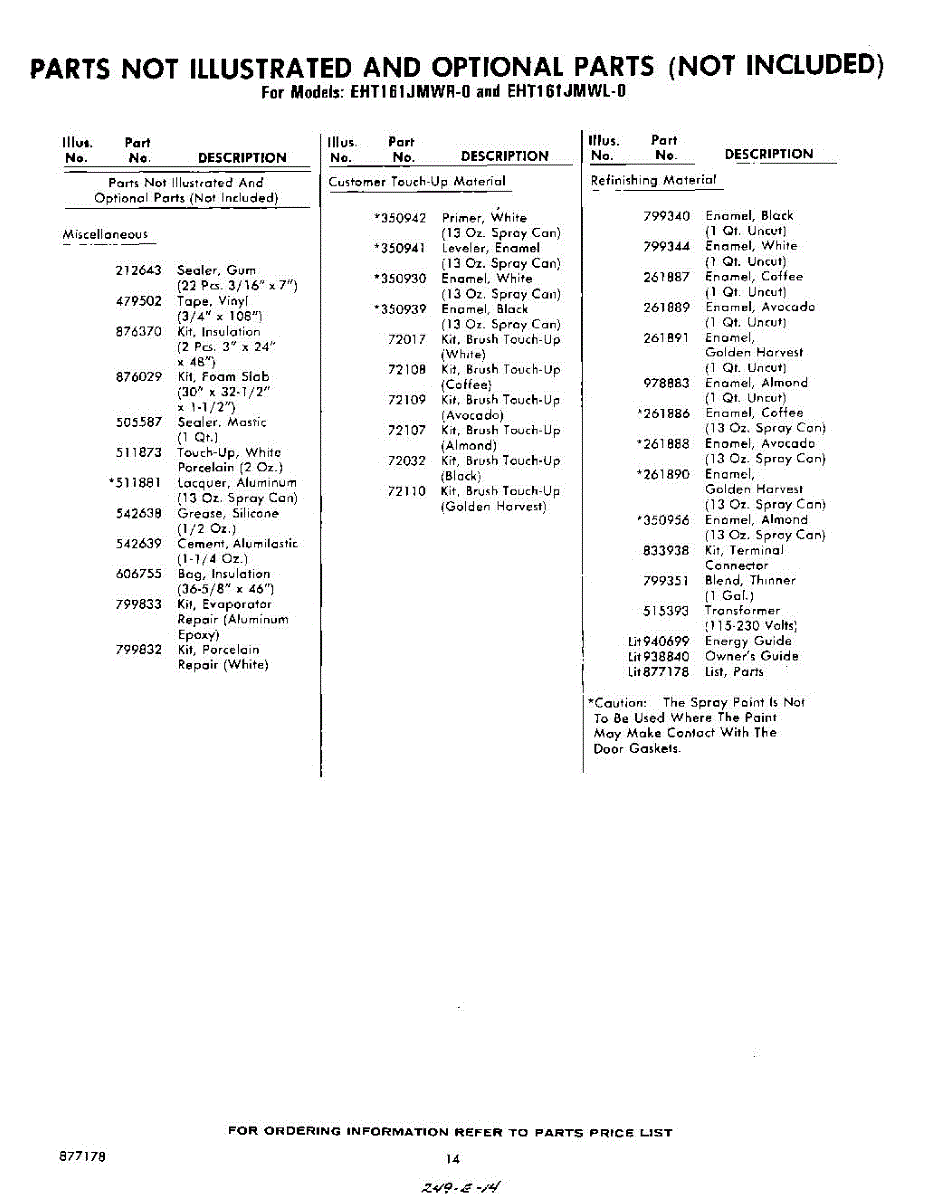 Parts for Whirlpool EHT161JMWR0: 14 - Not Illustrated And Optional Parts