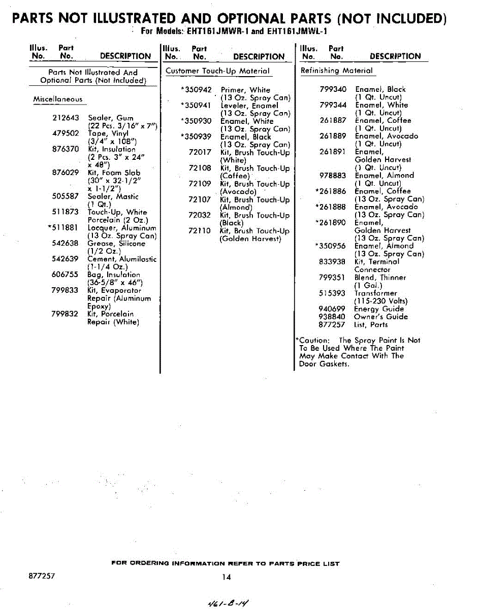 Parts for Whirlpool EHT161JMWR1: 14 - Not Illustrated And Optional Parts