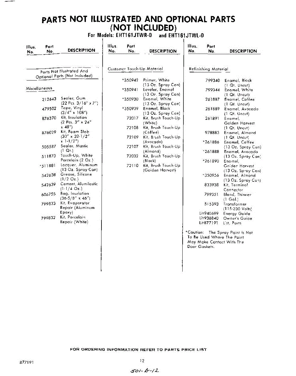 Parts for Whirlpool EHT161JTWR0: 12 - Not Illustrated And Optional Parts