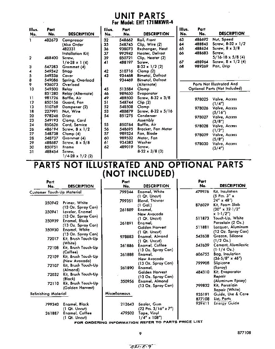 Parts for Whirlpool EHT171MKWR4: 09 - Not Illustrated And Optional Parts