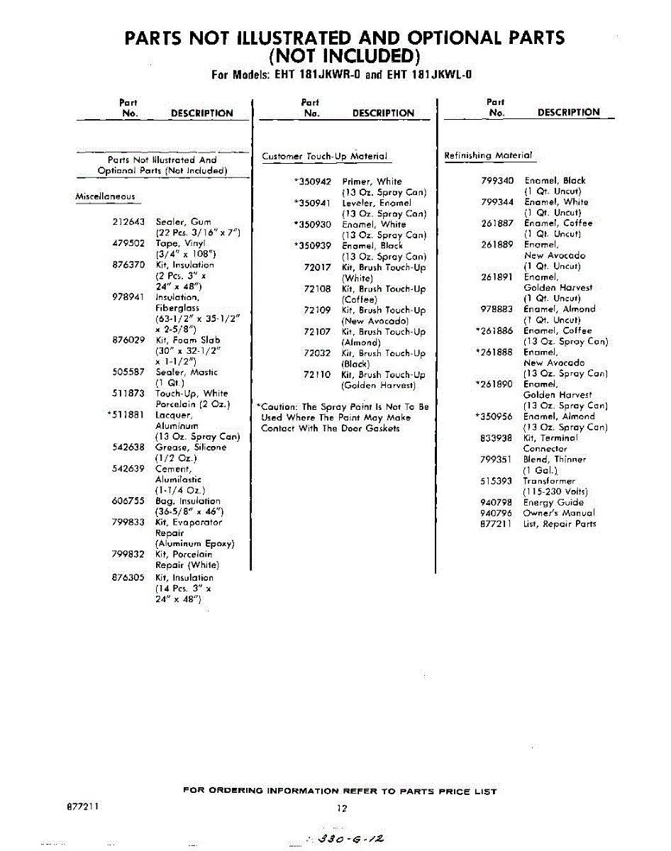 Parts for Whirlpool EHT181JKWR0: 12 - Parts Not Illustrated And Optional Parts