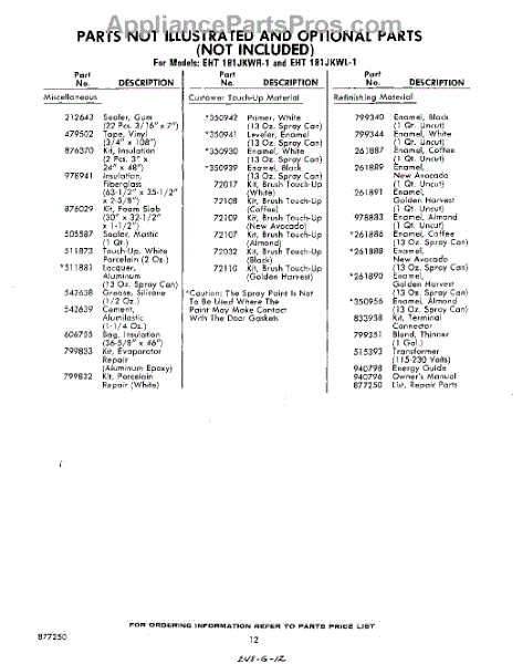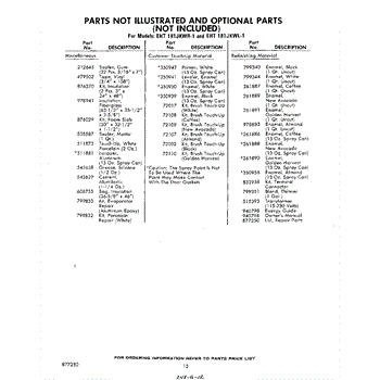 Parts for Whirlpool EHT181JKWR1: 12 - Not Illustrated And Optional Parts