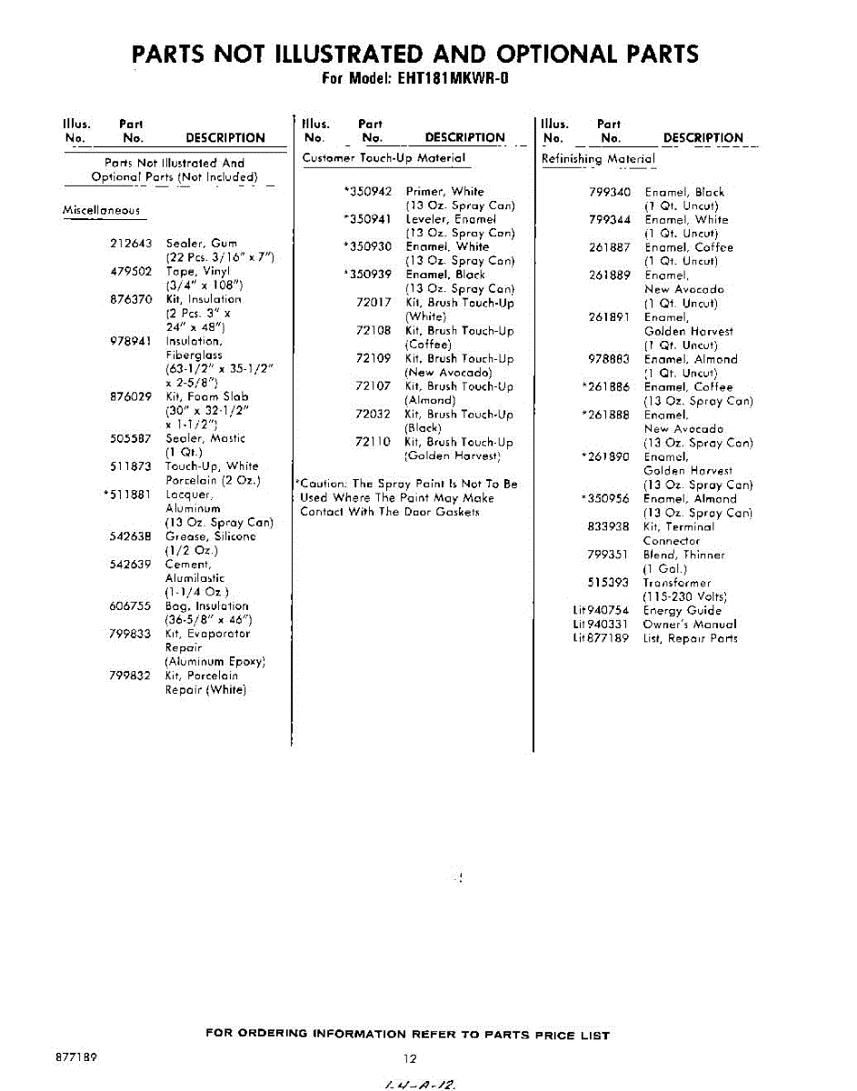Parts for Whirlpool EHT181MKWR0: 12 - Not Illustrated And Optional Parts
