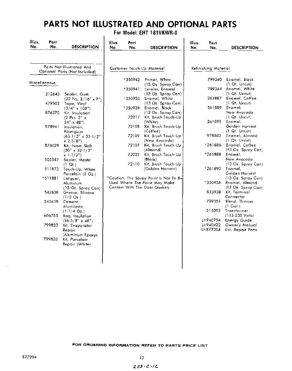 Parts for Whirlpool EHT181VKWR0: 12 - Not Illustrated And Optional Parts