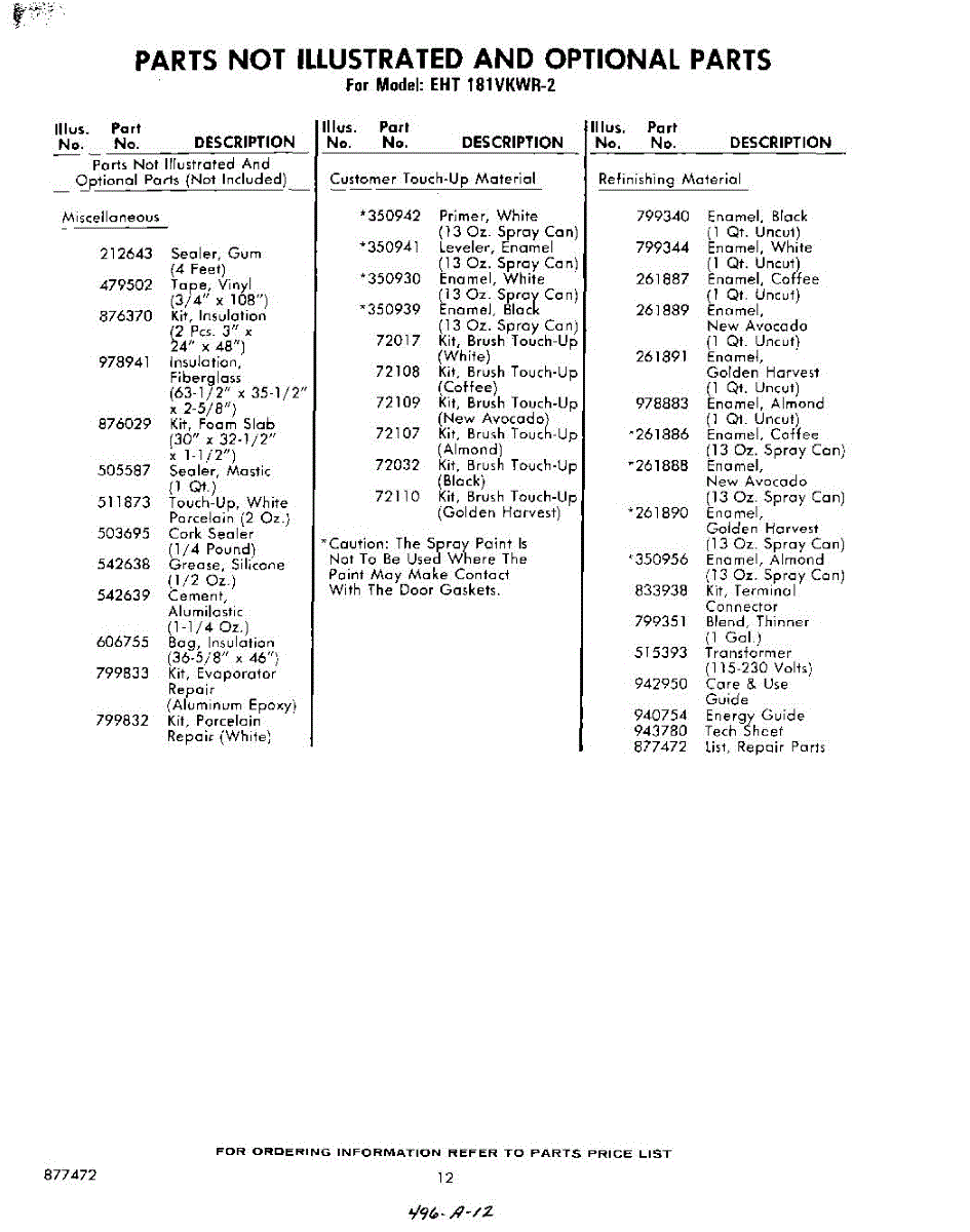 Parts for Whirlpool EHT181VKWR2: 12 - Not Illustrated And Optional Parts