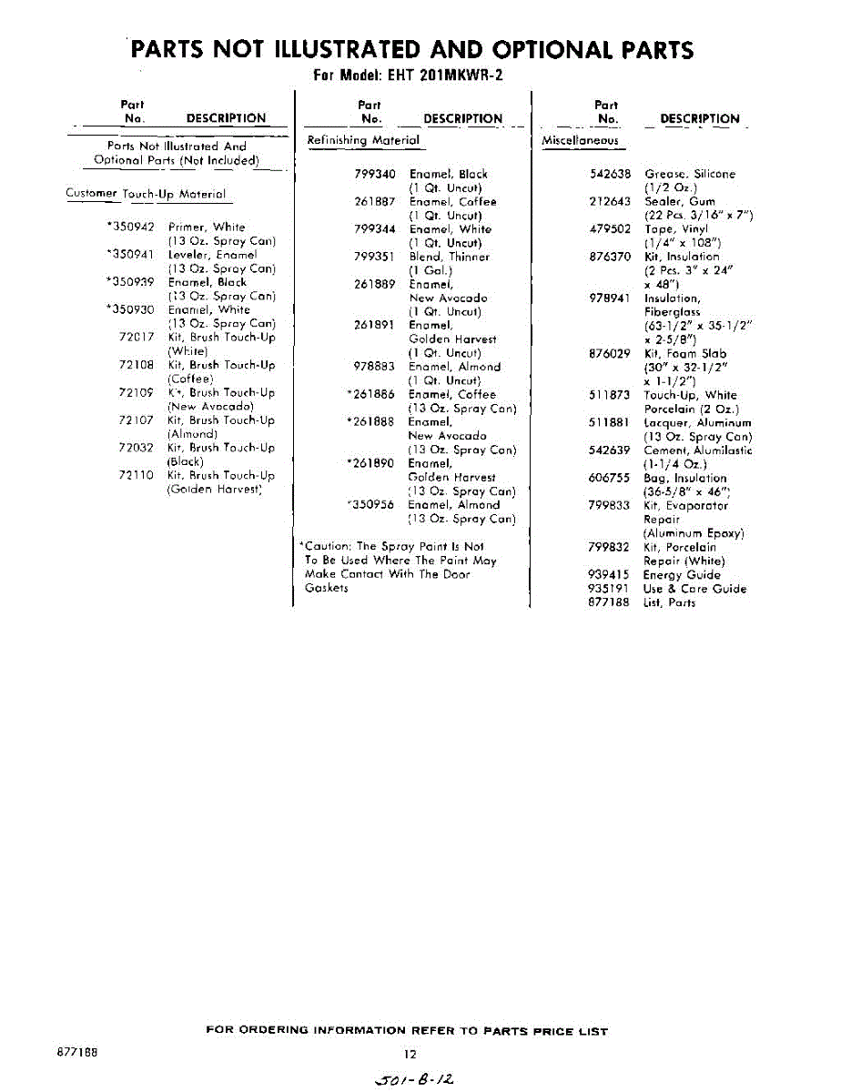Parts for Whirlpool EHT201MKWR2: 12 - Not Illustrated And Optional Parts