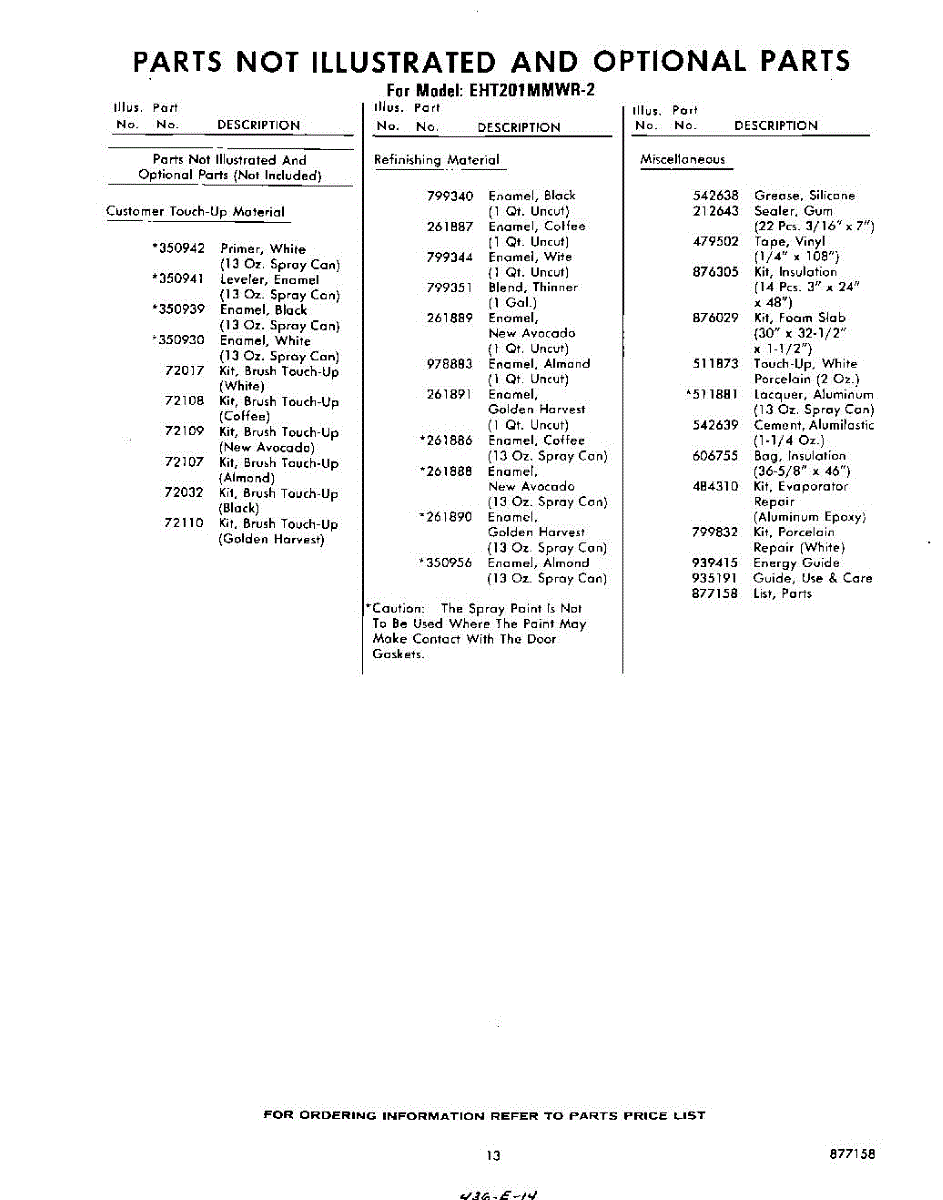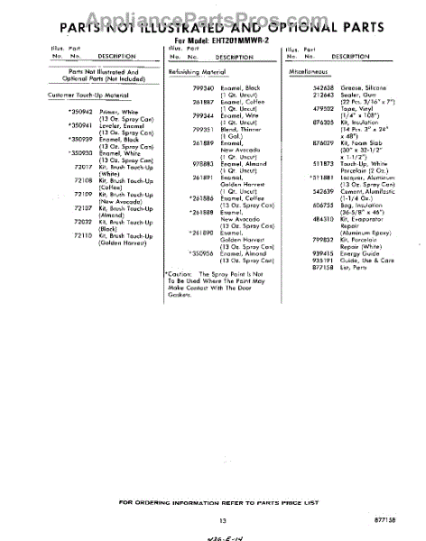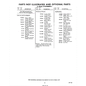 Parts for Whirlpool EHT201MMWR2: 13 - Not Illustrated And Optional Parts