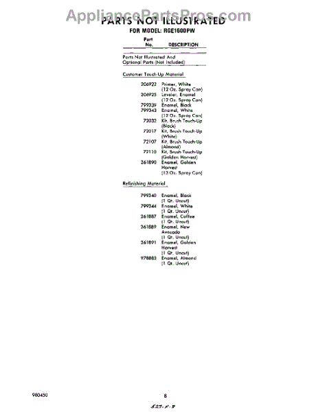 Parts for Whirlpool RGE1600PW: 08 - Parts Not Illustrated Parts