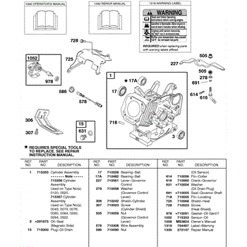 Parts for Briggs & Stratton 235436-0122-01: Oil Sensor Group, Operator's Manual, Repair Manual, Warning Label Parts