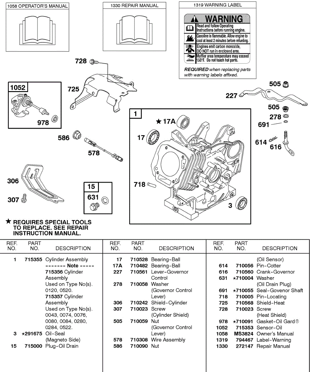 Parts for Briggs & Stratton 235437-0280-E9: Oil Sensor Group, Operator's Manual, Repair Manual, Warning Label Parts