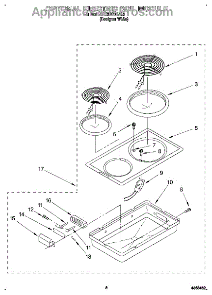 The 8-inch large Surface Element is an OEM replacement part for Whirlpool induction ranges. It serves as an integral independent heating zone to boil, sauté or simmer large pots quickly.