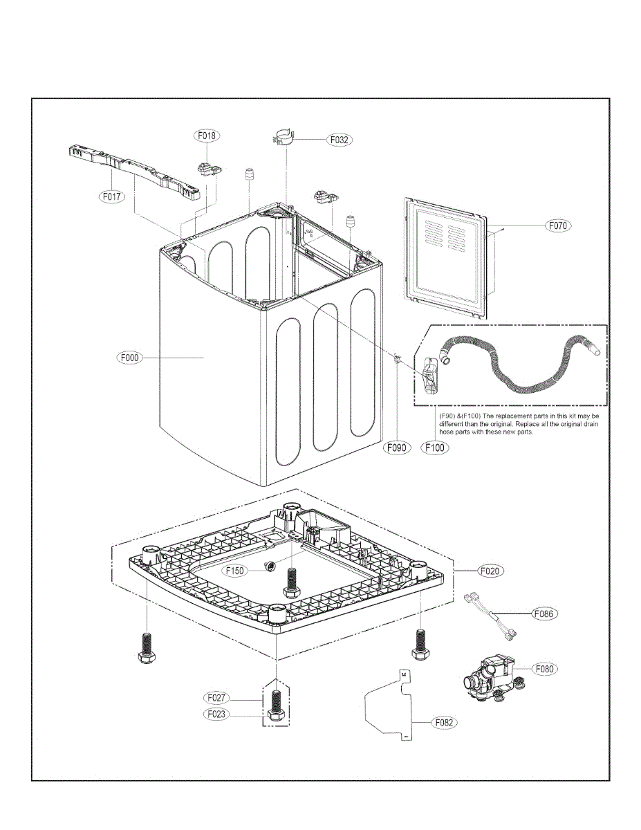 This drain hose directs used water from your washer to the household drain. Replace if cracked, split, leaking, or chewed through by rodents.