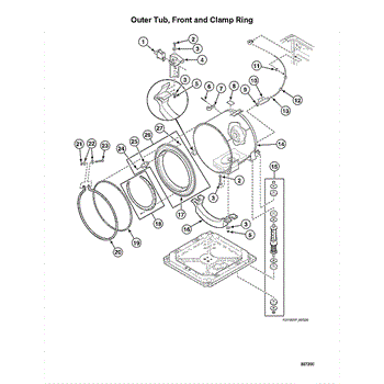 This front tub assembly is the outer wash tub section that supports and seals the washer drum, restoring proper water containment and tub alignment for top-load machines. Use when the outer tub is cracked, leaking, or misaligned. What it does: