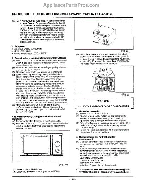 Parts for Samsung MW2130U/XAA: Oven (0.4 Cu Ft Procedure For Microwave Leakage Parts