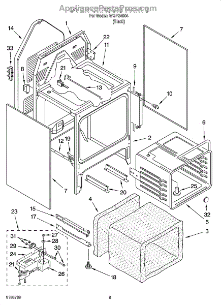 This terminal block is the insulated connection point where the appliance's incoming power ties into the internal wiring. Replacing a heat-damaged or loose block restores a safe, reliable electrical path and helps prevent arcing and intermittent power loss.