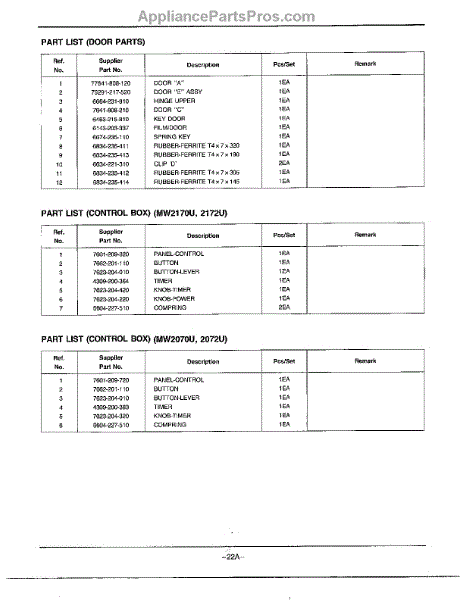 Parts for MW2072U/XAA