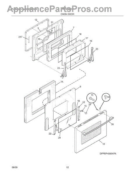 Secures the oven door handle in place. Replace if screw is stripped, missing, or no longer holding the handle firmly against the door surface.