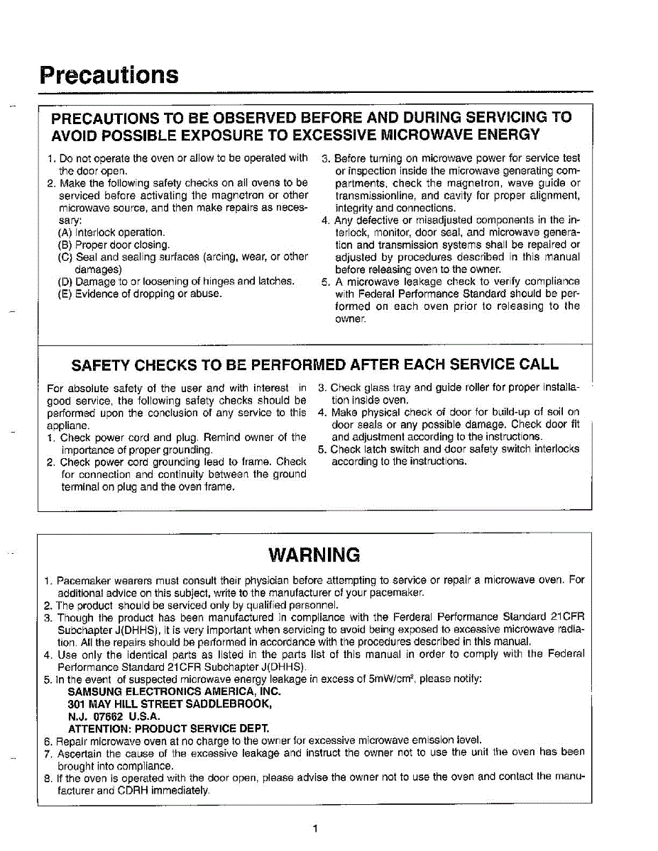 Parts for Samsung MW5720W/XAA: Oven Precautions / Safety Check / Warning Parts