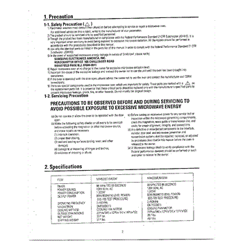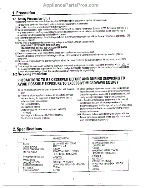 Parts for Samsung MW5330T/XAA: Oven Precautions / Specifications Parts