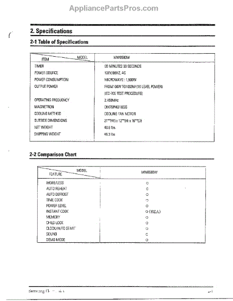 Parts for Samsung MW6580W/XAA: Oven Specifications Parts