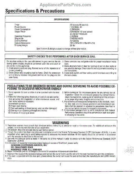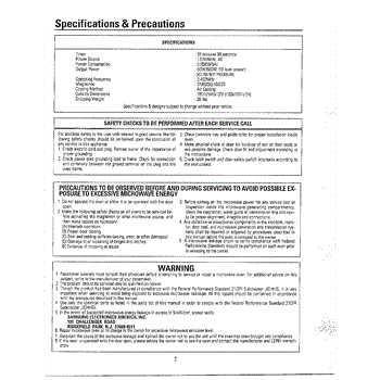Parts for Samsung MW3580T/XAA: Oven Specs And Precautions Parts