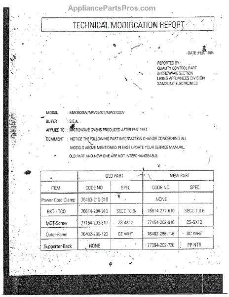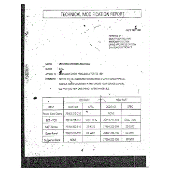 Parts for Samsung MW3530W/XAA: Oven Technical Modification Report Parts