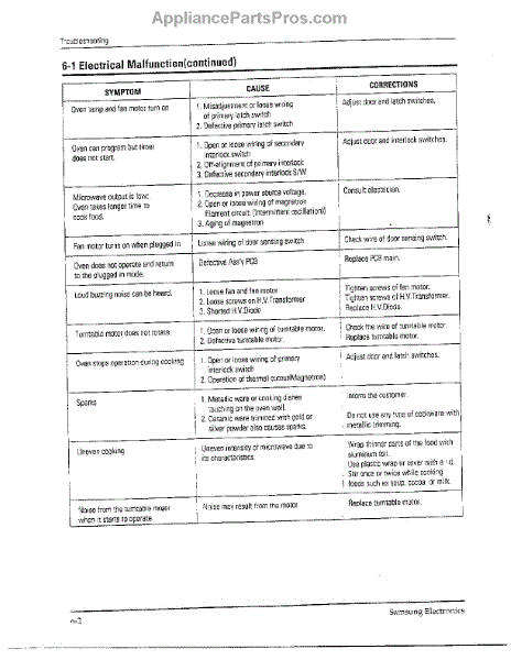 Parts for Samsung MW5580W/XAA: Oven Troubleshooting Page 2 Parts
