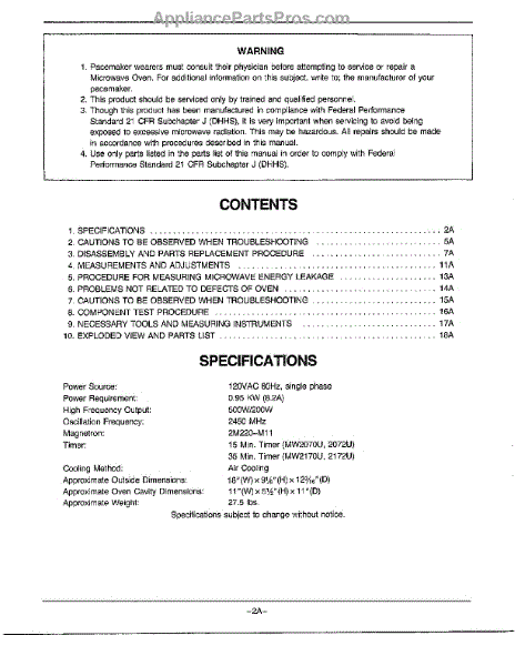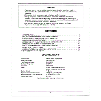 Parts for Samsung MW2070U/XAA: Oven Warning / Contents / Specifications Parts